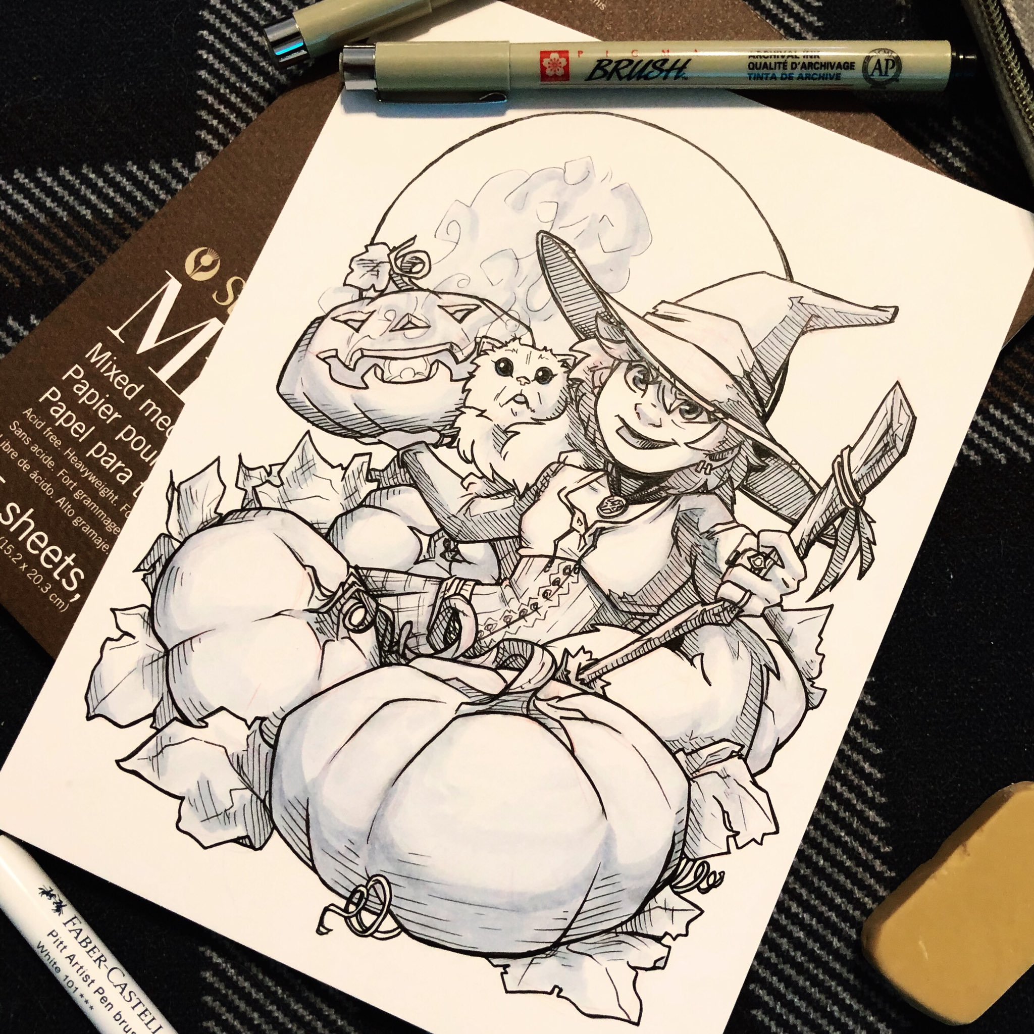 You've probably seen the colored version elsewhere by now, but here's the original piece! A 6in by 8in ink on mixed-media piece from October 2019.