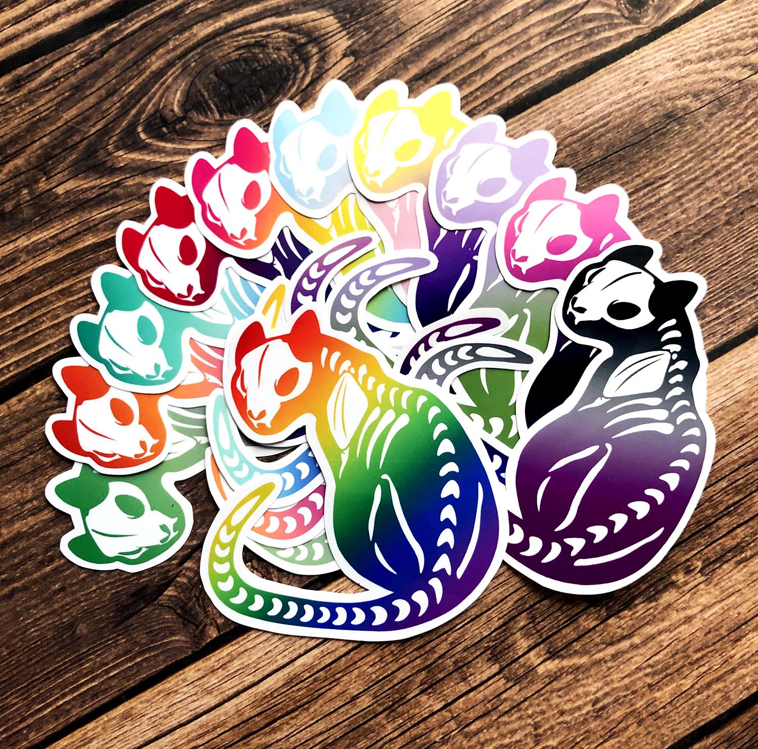 Each cat is 2.5 inches wide, featuring a gradient of color from one of 11 different LGBTQ+ pride flags.